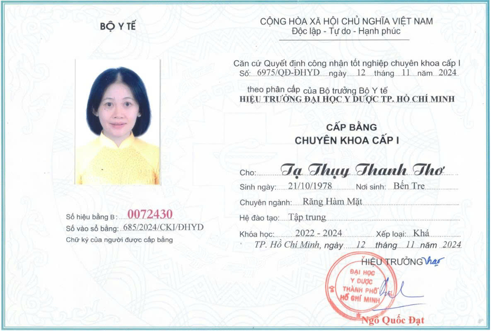 • Bác sĩ Chuyên khoa cấp 1 năm 2024 tại khoa Răng hàm mặt trường Đại học Y dược TP.HCM.