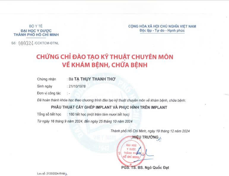 • Chứng chỉ cấy ghép Implant và phục hình trên Implant được cấp bởi Khoa Răng Hàm Mặt trường Đại học Y Dược TP. HCM