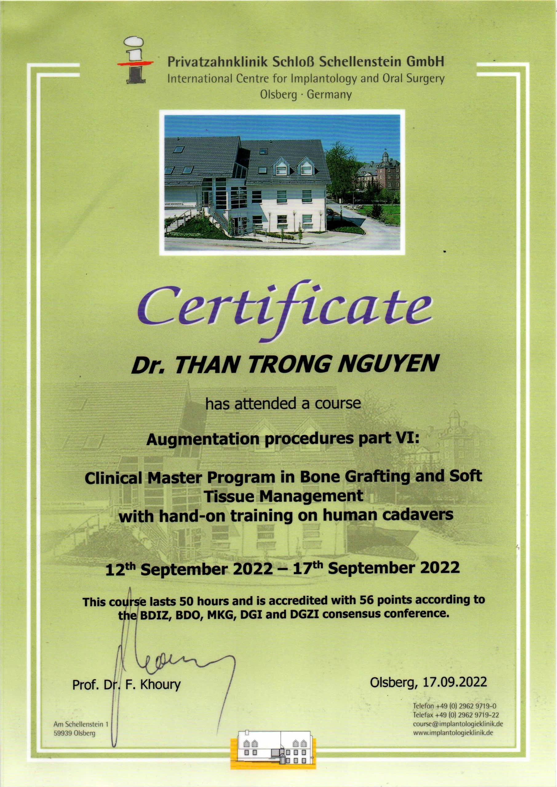 - Chứng chỉ tập huấn, đào tạo Implant và mô mềm chuyên sâu tại Đức, Ý, Hungary.